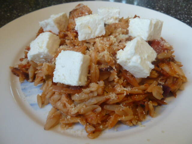 Gieten we een beetje wijn erbij en als het droog is snijden we het in kleine stukjes en doen we het in de ovenschaal met kritharaki.