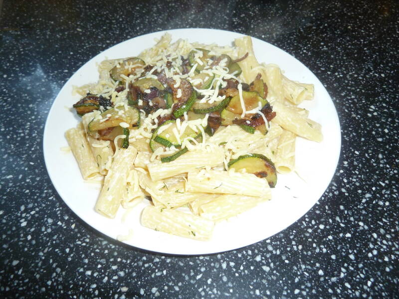 - Roeren we de mix met de rigatoni en boven in doen we de mix met uien en courgette en als laatste de geraspte kaas.